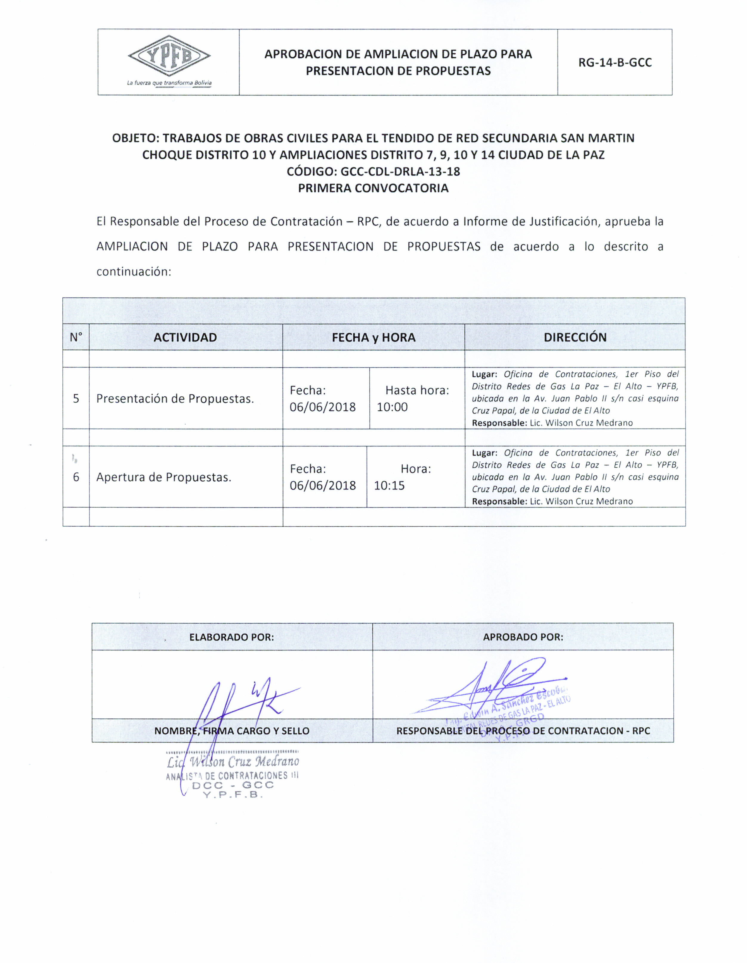 | Lugar de presentación: | Lugar: Oficina de Contrataciones, 1er Piso de Distrito Redes de Gas La Paz ? El Alto ? YPFB, ubicada en la Av. Juan Pablo II sn casi esquina Cruz Papal, de la Ciudad de El Alto |